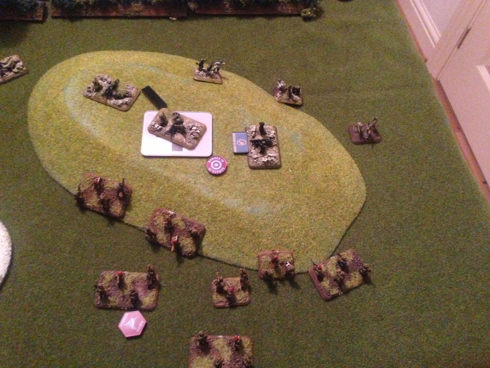 The Para's on the left flank moved into assault range but when they assaulted Dave managed to pin them back, losing a couple of stands. On the right flank, the Para's moved into assault range with the artillery pinning the HMG's but in the end only the observer over there dies. Meanwhile the 3rd Para platoon advanced as the mortars and 1 squad of 6PDR's arrived.